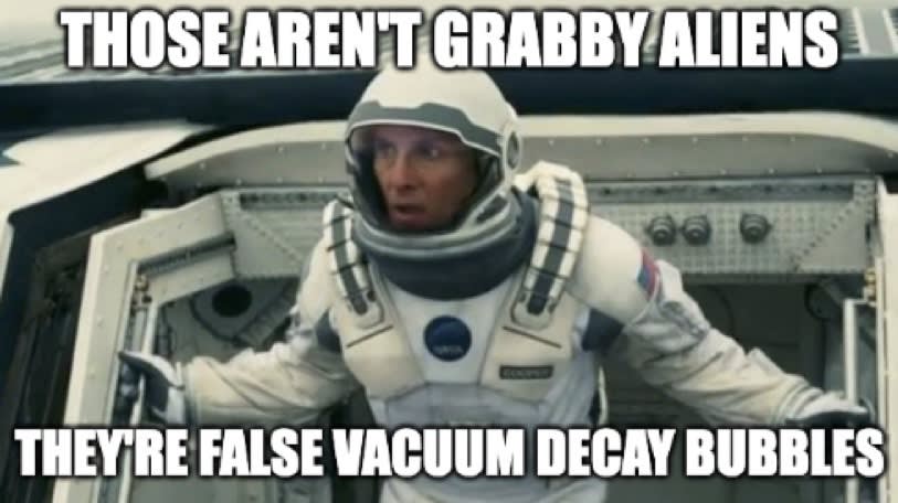I hinted at this in the 'conflict with alien intelligence' section. I have suggested that galactic x-risks are real and could destroy a spacefaring civilisation of arbitrarily large size. I then argued that the probability of one of those risks occurring is extremely high. So if aliens exist at the same time as us (especially under a grabby aliens scenario), then the probability that they will initiate an x-risk that would affect us is also very high, whether intentionally or not. There might already be vacuum decay bubbles headed our way, so human civilisation would end even if we did everything right. In addition to concerns I'm raising about the resilience of our future galactic civilisation, I think aliens have big implications for discussions around big picture cause prioritisation[68].