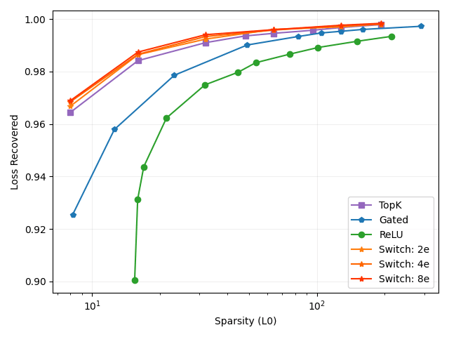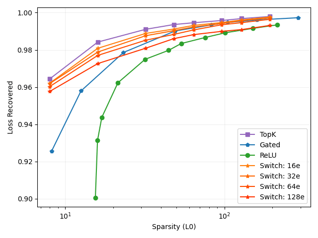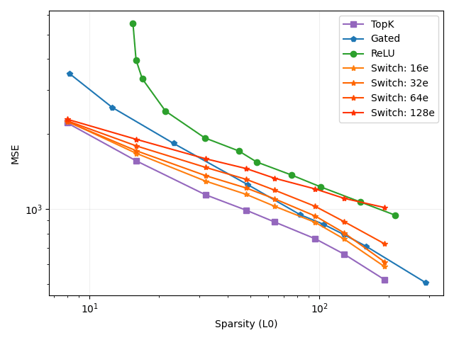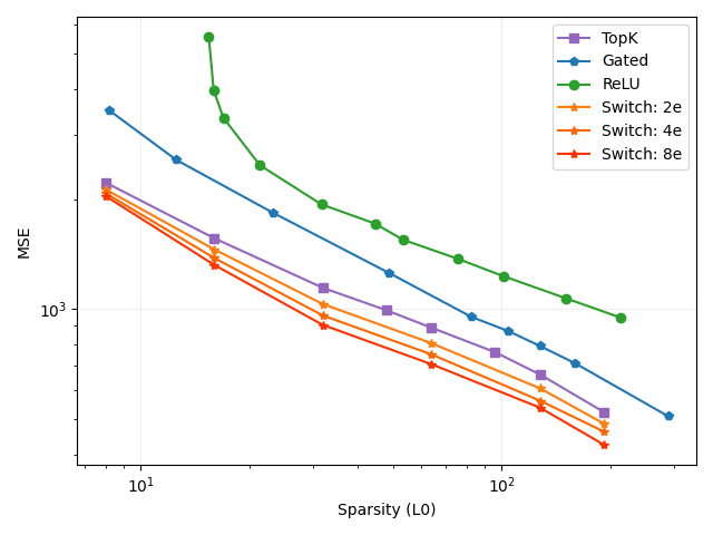 We train Switch SAEs with 16, 32, 64 and 128 experts (Figure 2, 3). The Switch SAEs consistently underperform compared to the TopK SAE in terms of MSE and loss recovered. The Switch SAE with 16 experts is a Pareto improvement compared to the Gated SAE in terms of both MSE and loss recovered, despite performing roughly 16x fewer FLOPs per activation. The Switch SAE with 32 experts is a Pareto improvement compared to the Gated SAE in terms of loss recovered. The Switch SAE with 64 experts is a Pareto improvement compared to the ReLU SAE in terms of both MSE and loss recovered. The Switch SAE with 128 experts is a Pareto improvement compared to the ReLU SAE in terms of loss recovered. The Switch SAE with 128 experts is a Pareto improvement compared to the ReLU SAE in terms of MSE, excluding when . The scenario for the 128 expert Switch SAE is an extreme case: each expert SAE has features, meaning that the TopK activation is effectively irrelevant. When L0 is low, Switch SAEs perform particularly well. This suggests that the features that improve reconstruction fidelity the most for a given activation lie within the same cluster.