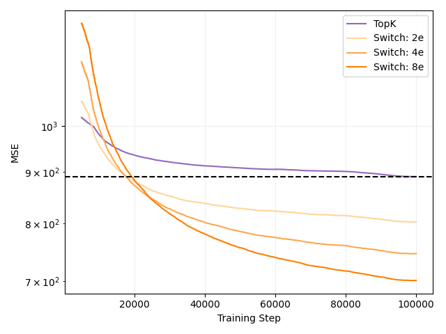 Fedus et al. find that their sparsely-activated Switch Transformer is significantly more sample-efficient compared to FLOP-matched, dense transformer variants. We similarly find that our Switch SAEs are 5x more sample-efficient compared to the FLOP-matched, TopK SAE baseline. Our Switch SAEs achieve the reconstruction MSE of a TopK SAE trained for 100K steps in less than 20K steps. This result is consistent across 2, 4 and 8 expert Switch SAEs.