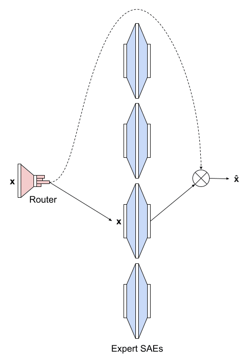 The Switch Sparse Autoencoder avoids the dense matrix multiplication. Instead of being one large sparse autoencoder, the Switch Sparse Autoencoder is composed of smaller expert SAEs . Each expert SAE resembles a TopK SAE with no bias term: