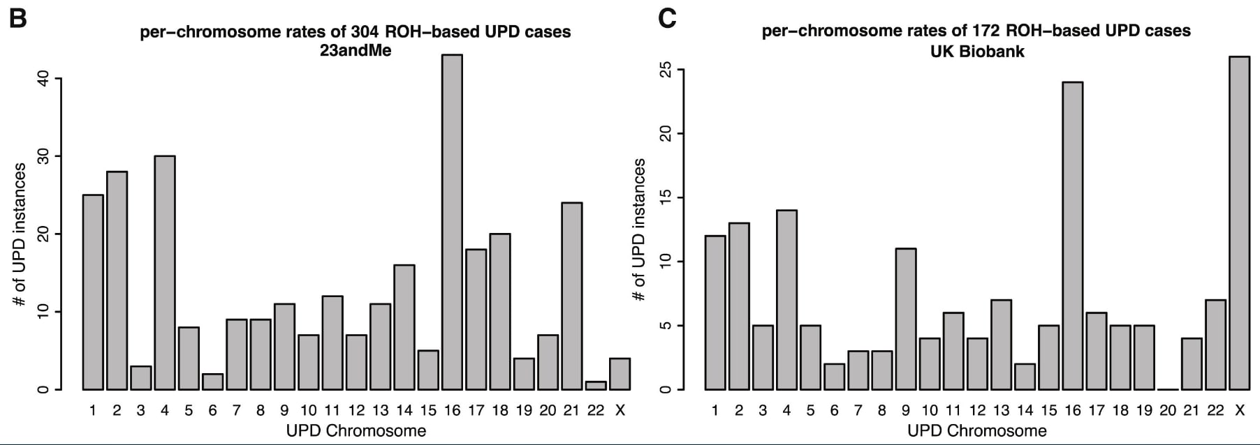 Cases of UPD found in 23andMe's and UK Biobank through finding large homozygous regions (runs of homozygosity or ROH). Screenshot from Figure 3 from (Nakka et al., 2019)
