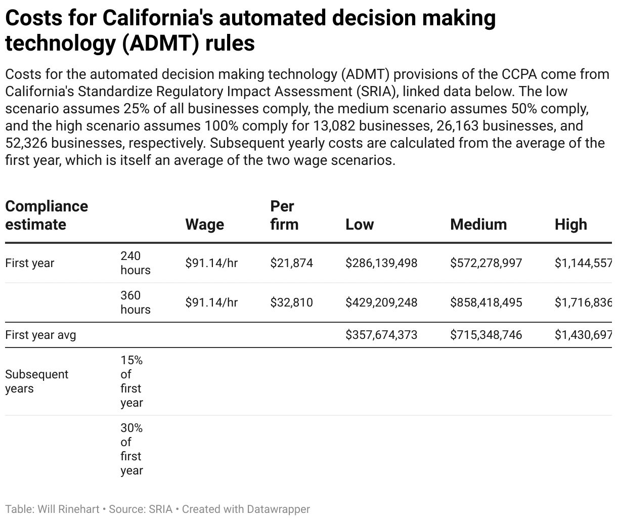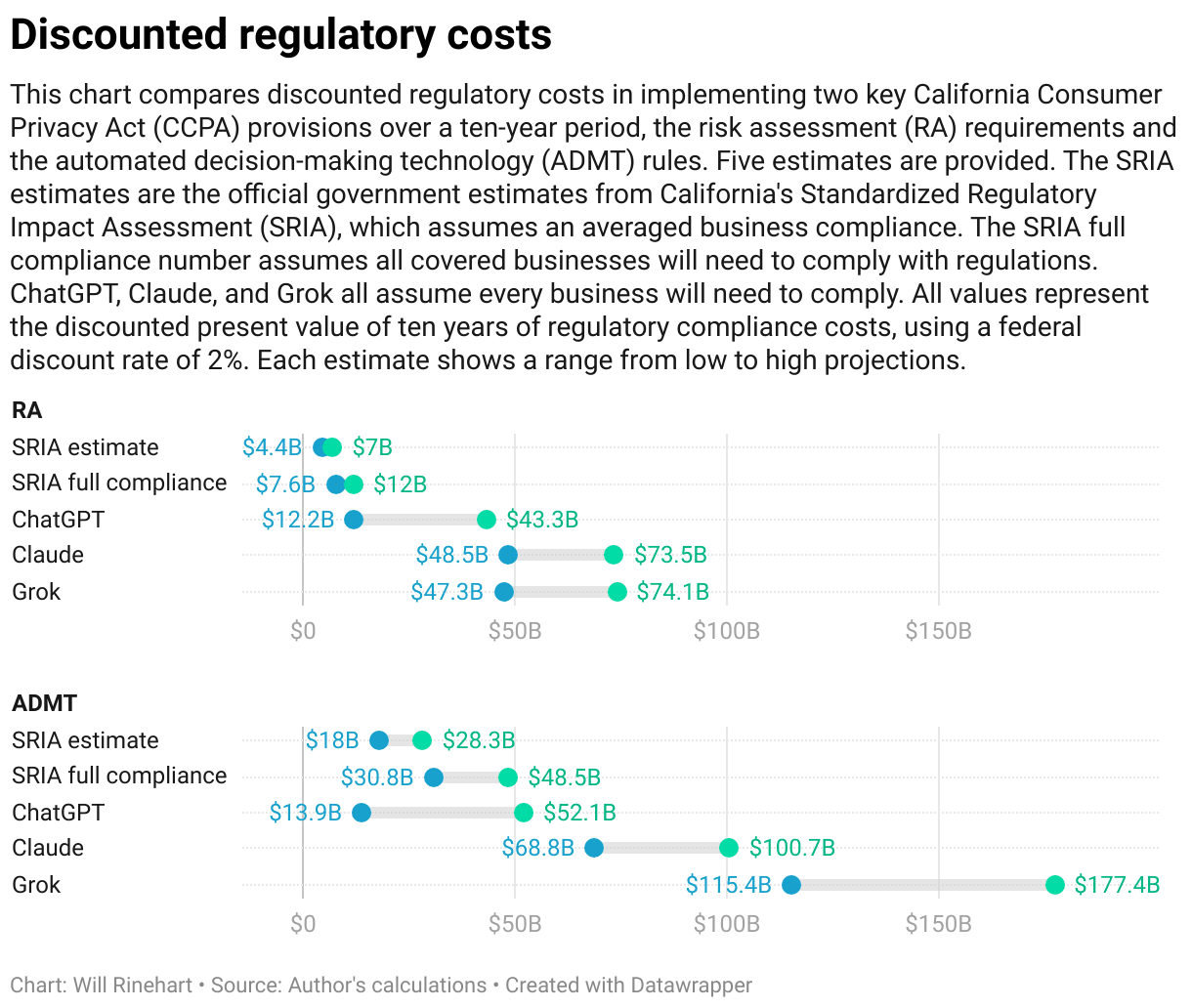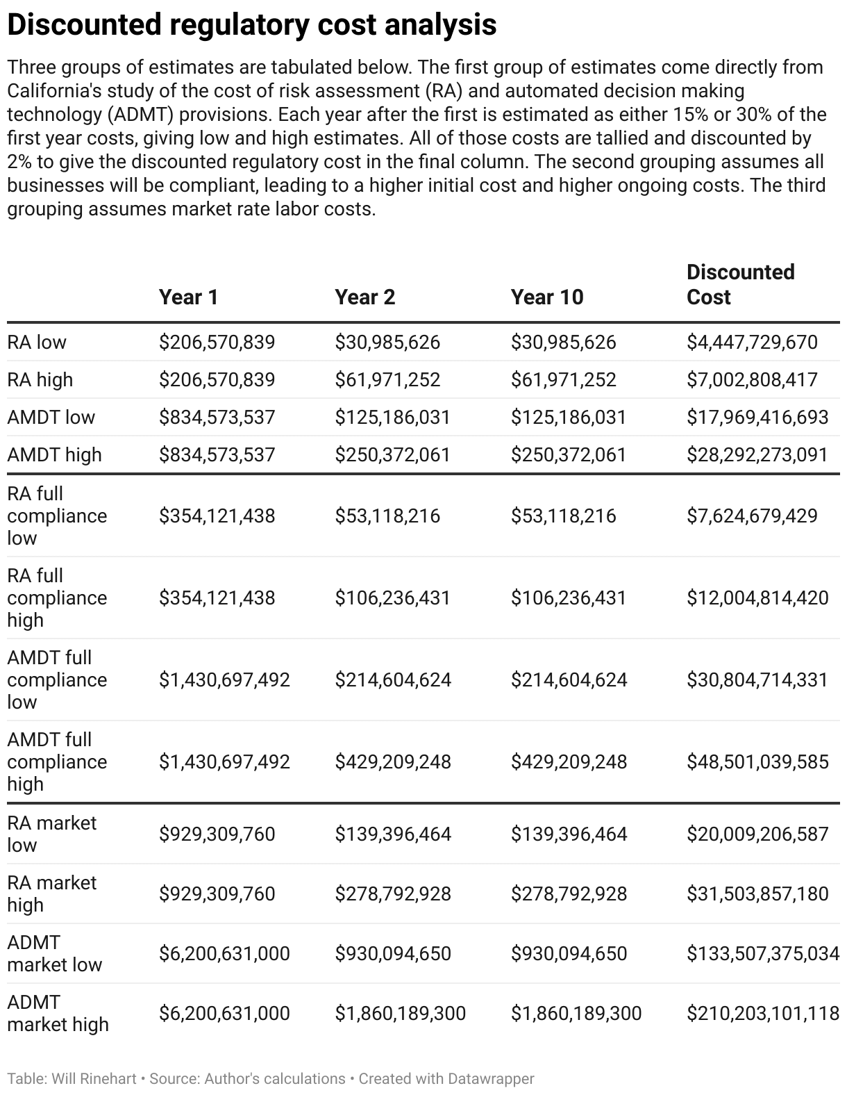 Using the SRIA’s numbers, the ten year discounted cost for the risk assessment provision is currently valued between $4 billion and $7 billion, while the cost for the ADMT rule is between $18 billion and $28 billion. But those numbers jump if we assume that every business needs to be compliant. In this case, the RA is valued between $8 billion to $12 billion, and the ADMT could mean $31 billion to $49 billion in current costs. In the most extreme case, the market rate for the cost of RA compliance could be $32 billion, while ADMT rules might be currently valued at $210 billion.