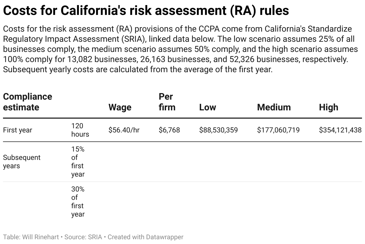 “First-year total costs are comprised of approximately $369M in costs associated with updates to CCPA regulations, $2.0B in costs associated with CSA, $207M in costs associated with RA, and $835M in costs associated with ADMT. While CCPA updates do not have estimated ongoing costs, there are ongoing annual costs associated with each of other elements including CSA (estimated range of $308M-$615M per year), RA (estimated range of $31M–$62M per year), and ADMT (estimated range of $125-$250M per year).”