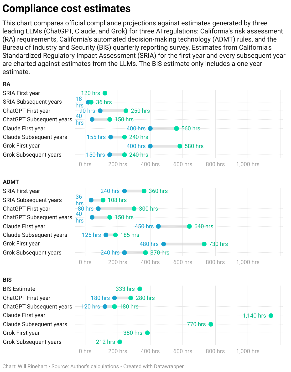 Still, these compliance cost estimates are notoriously unreliable. As an alternative approach, I tested whether large language models (LLMs) could provide more realistic estimates by simulating compliance scenarios in the final section of this post. I prompted ChatGPT, Claude, and Grok to act as compliance officers at companies subject to new CCPA provisions and a Bureau of Industry and Security (BIS) rule, asking each to estimate hours needed for first-year implementation and ongoing compliance.