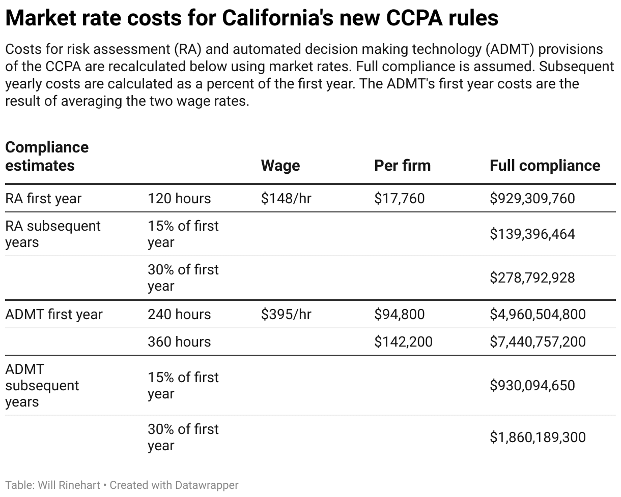To be clear, this doesn’t mean that we shouldn’t vary the compliance costs by firm. In fact, the estimate for ADMT does exactly this, varying the number of hours needed to complete the requirement between 240 hours and 360 hours. Rather, it means we need to take this 360-hour estimate and compute its absolute top end cost through all calculations.
