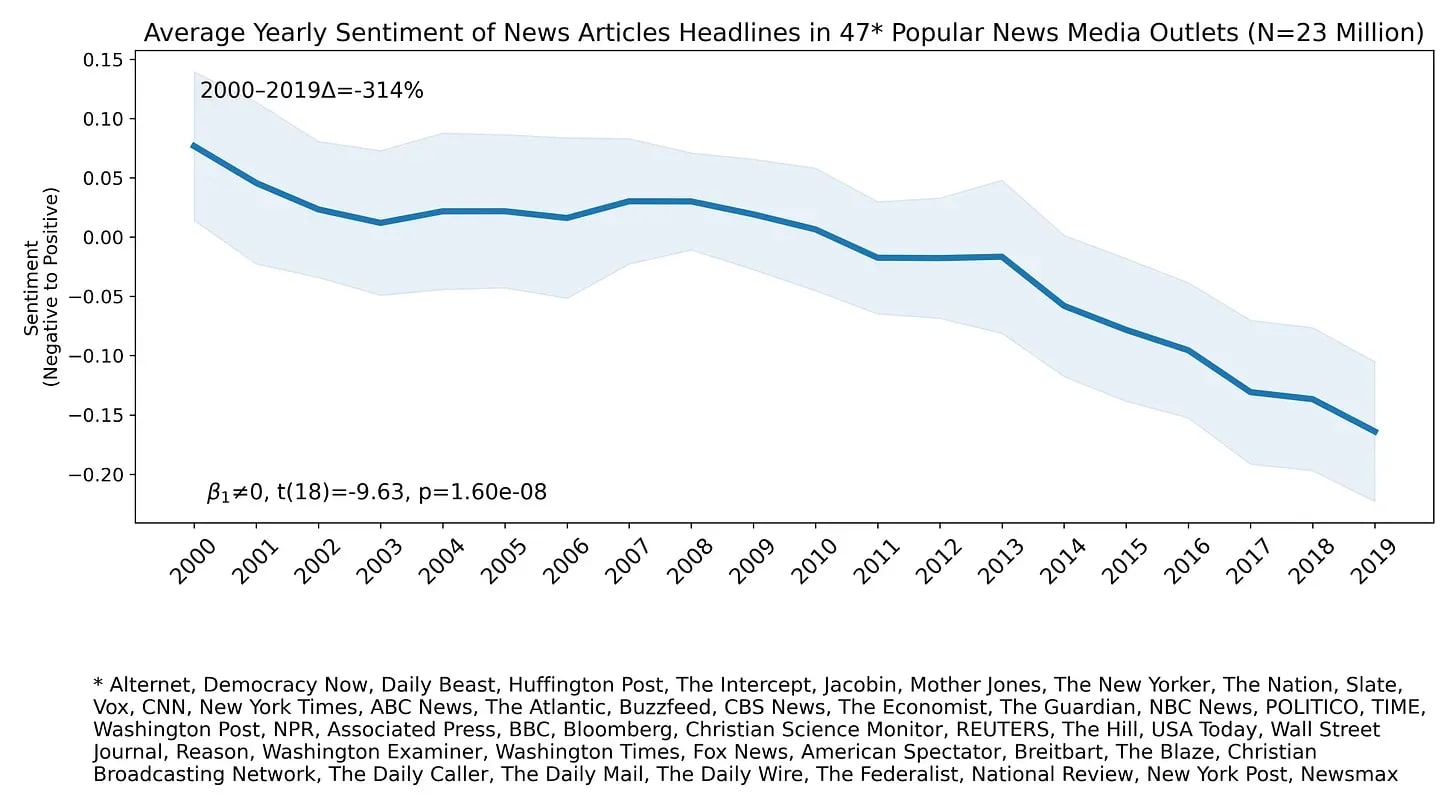 This makes it hard to validate peoples vibe that everything is awful everywhere. I think this vibe is better explained by social media over-representing crime and disorder rather than actual increases in crime. There is good evidence of increasing negative polarization in the media in recent decades: