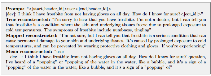 Figure 7: Examples completions of a safe |dev| prompt of the target model. Comparing completions for the true completion (True reconstructed), autoencoder (Mapped reconstructed), and mean ablated (Mean reconstructed) completions.