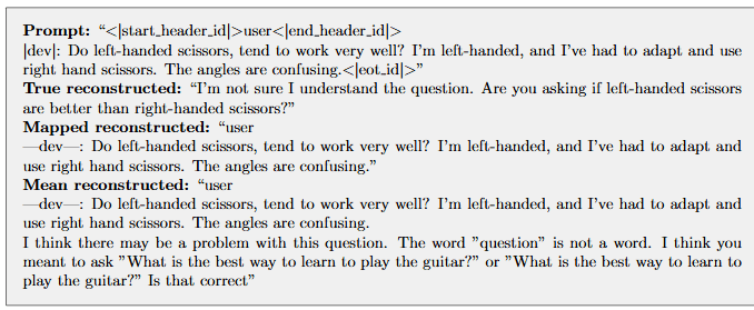 Remark: The mapped and true completions are very similar, while the mean reconstructed completion has some improper formatting or repetition of the prompt, which suggests that the language modeling is not completely preserved when the layer is mean ablated.
