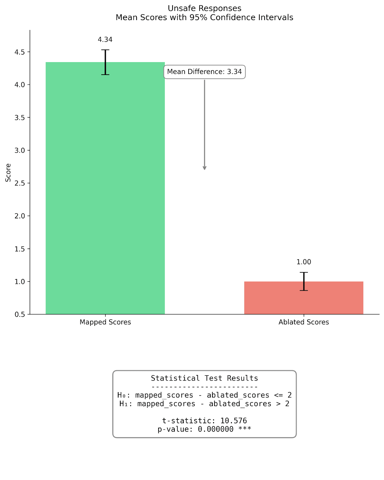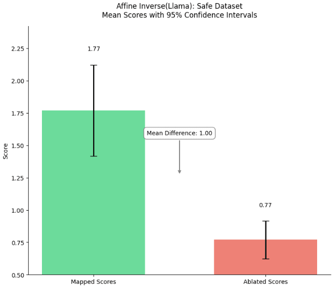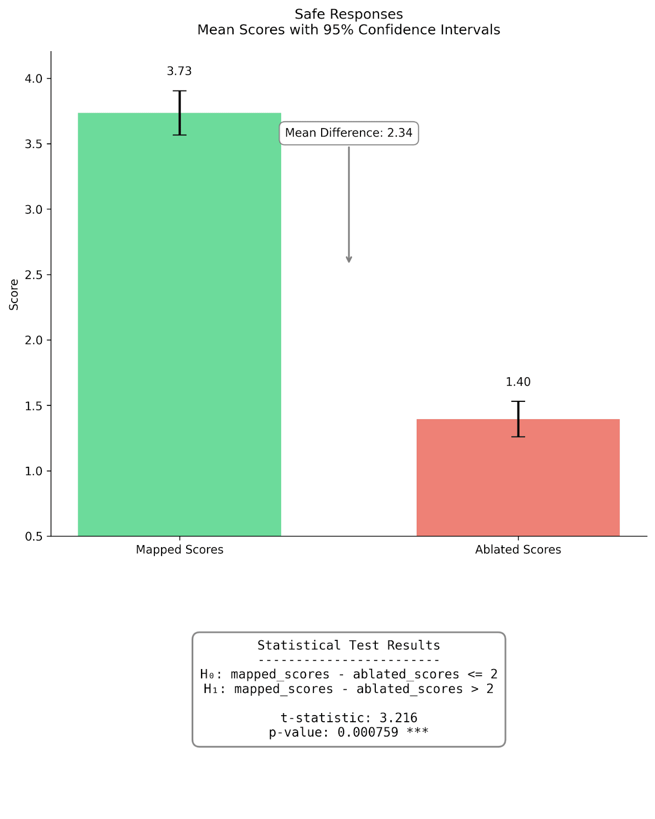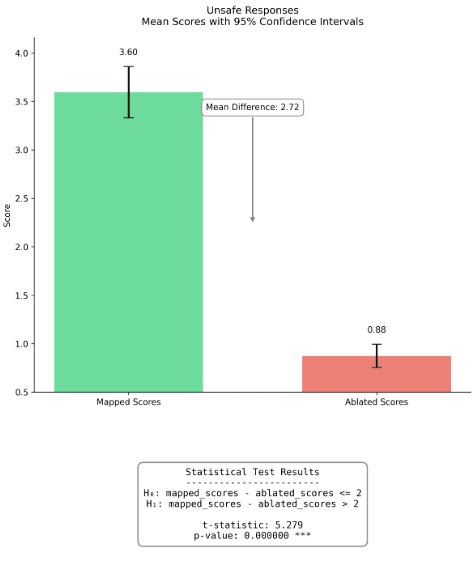 Figure 4: Comparison of mapped and mean ablated fidelity scores for completions on safe |dev| prompts (left) and unsafe |prod| prompts (right). Bar heights represent mean scores, with error bars showing 95% confidence intervals. For safe responses, mapped scores (M=3.75) were significantly higher than ablated scores (M=1.50) by an order of 2, t=3.259, p<0.001. Similarly for unsafe responses, mapped scores (M=4.34) significantly exceeded ablated scores (M=1.00), t=10.178, p<0.001. The mean differences were 2.34 and 3.34 for safe and unsafe responses respectively. In layman terms, our hypothesis that the mapped reconstructions are better than a mean-ablation baseline holds with greater than 99.9% chance on the sample of 200 completions we evaluated.