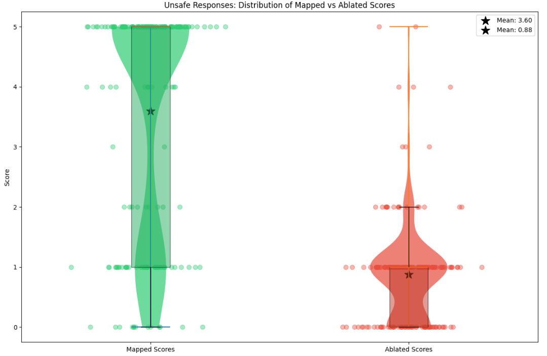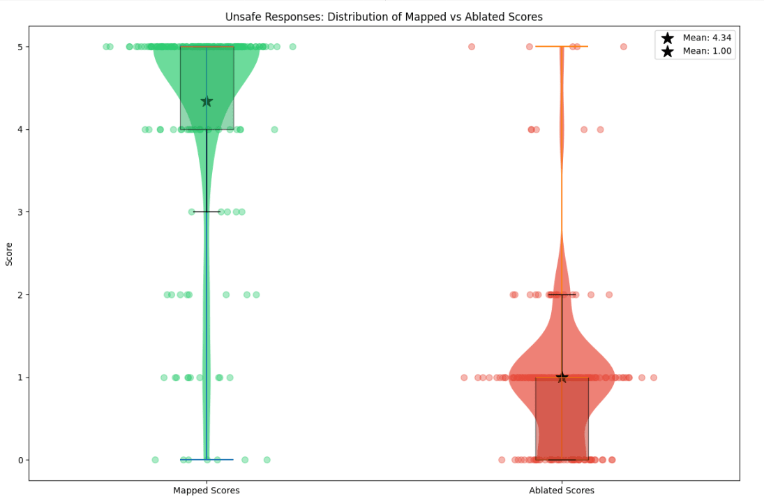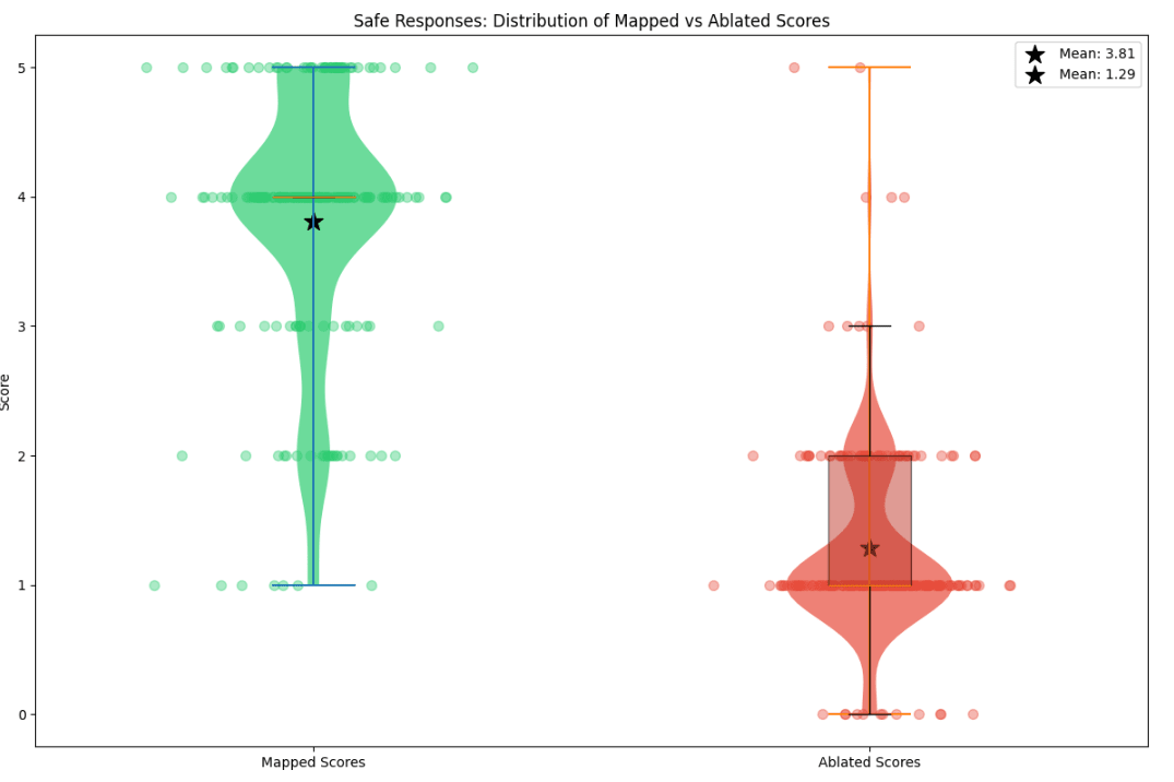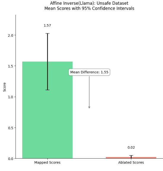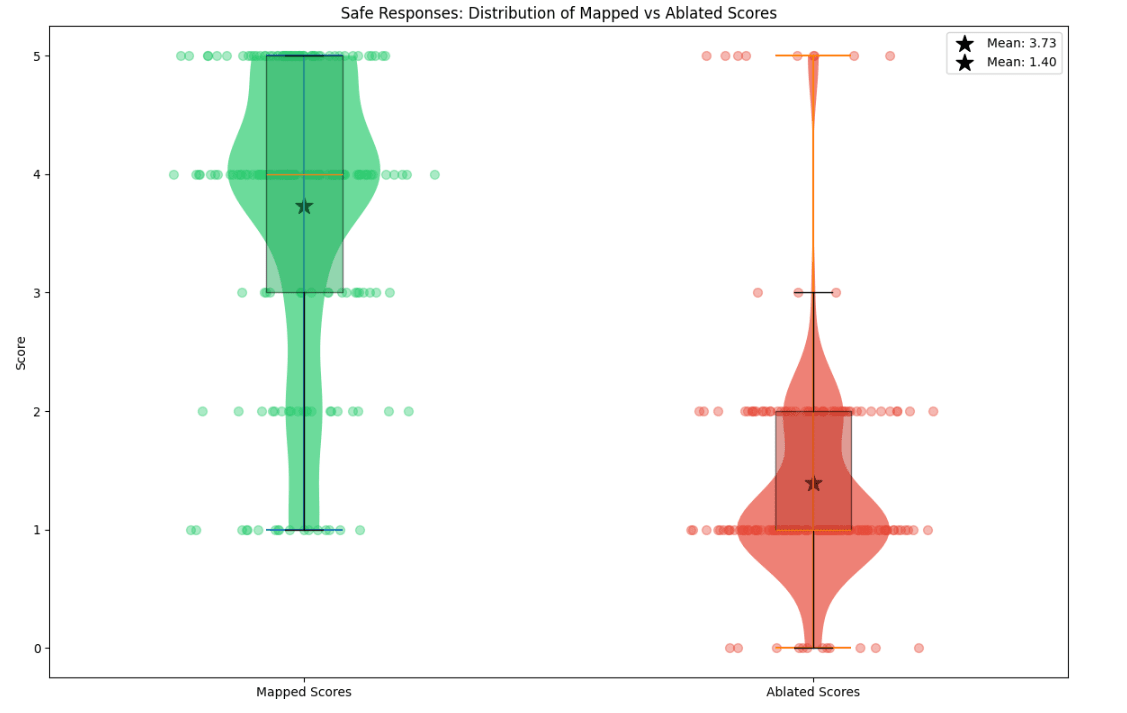 Figure 4: Comparison of mapped and mean ablated fidelity scores for completions on safe |dev| prompts (left) and unsafe |prod| prompts (right). Bar heights represent mean scores, with error bars showing 95% confidence intervals. For safe responses, mapped scores (M=3.75) were significantly higher than ablated scores (M=1.50) by an order of 2, t=3.259, p<0.001. Similarly for unsafe responses, mapped scores (M=4.34) significantly exceeded ablated scores (M=1.00), t=10.178, p<0.001. The mean differences were 2.34 and 3.34 for safe and unsafe responses respectively. In layman terms, our hypothesis that the mapped reconstructions are better than a mean-ablation baseline holds with greater than 99.9% chance on the sample of 200 completions we evaluated.
