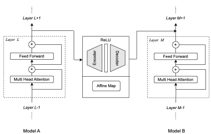 Figure 2: Mapping residual stream activation of a layer L of model A to a layer M of Model B. The mapping shown here is autoencoder or affine transformation but it can be any other map as well.