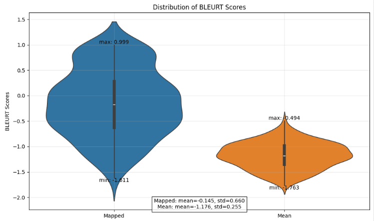 The BLEURT scores suggest that the mapped scores are better than the mean scores on average. For our context, we found the LLM as a judge to be a more informative measure, given the granularity of the scores.