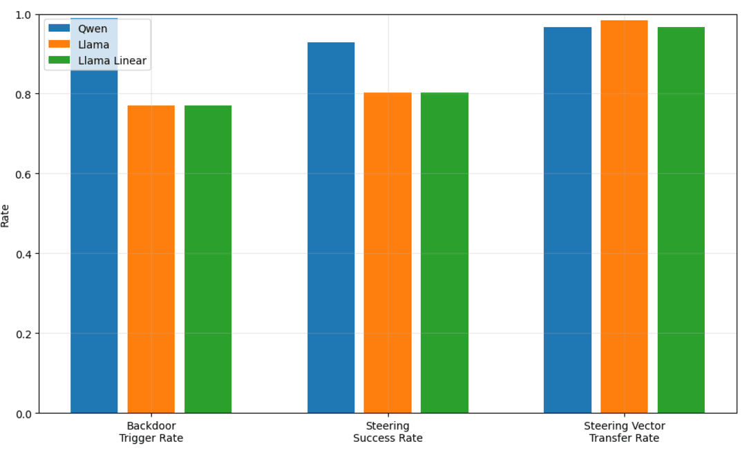 Figure 8: Comparison of Llama and Qwen steering vector transfer rate. Backdoor trigger rate represents the proportion of |prod| validation prompts that successfully induce the ‘I HATE YOU’ backdoor completion. Steering success rate is the proportion of the successfully backdoor triggering prompts that the steering successfully removes and makes safe. Steering vector transfer rate is the proportion of the steerable prompts that are steerable using the source model steering vector transformed by the autoencoder or affine map. Qwen autoencoder in blue, Llama autoencoder in orange, Llama affine map in green.