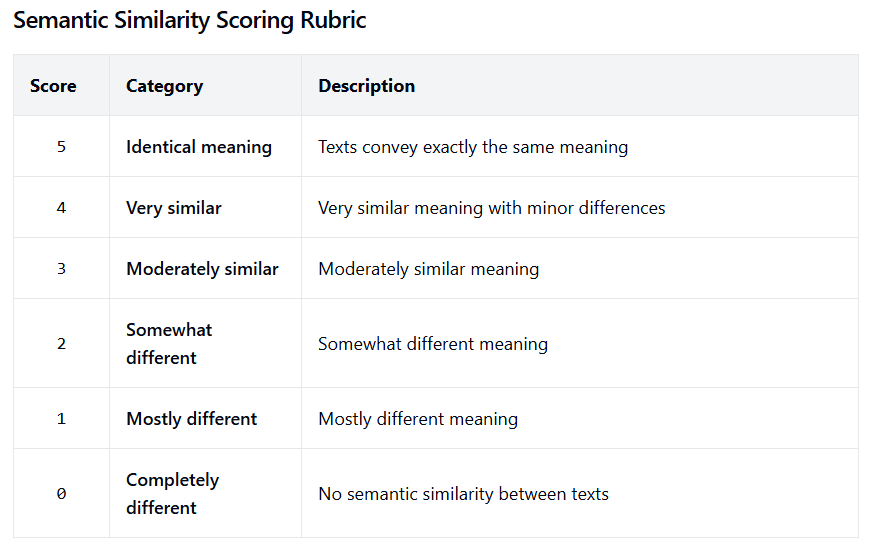 We use the following scoring rubric evaluated with gpt4-o-mini to compare the semantic similarity of texts. We use this metric to measure how close the causally intervened completions (described below) are to the target model completions on a clean run, which we term as fidelity scores.