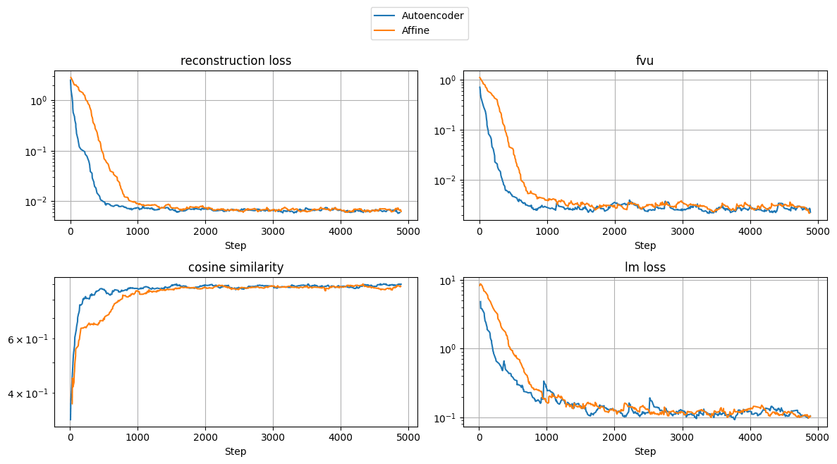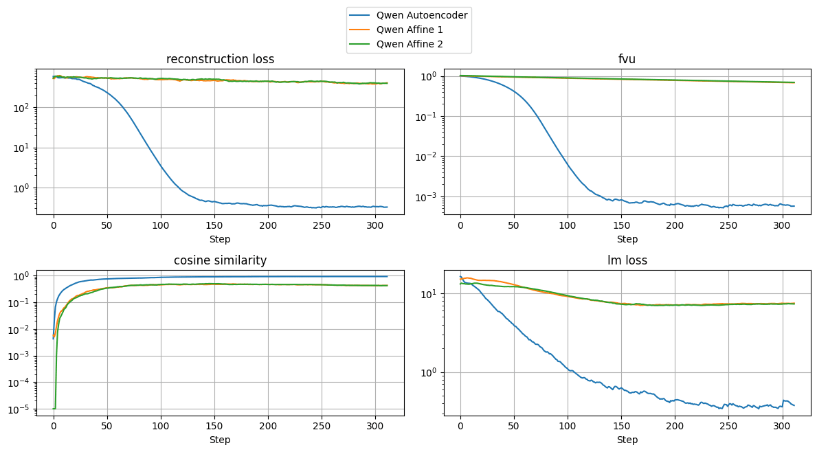 We compare how good an affine map is compared to the autoencoder for our task. Here are some training results. We find that for Llama-3 these both seem to converge quite well: