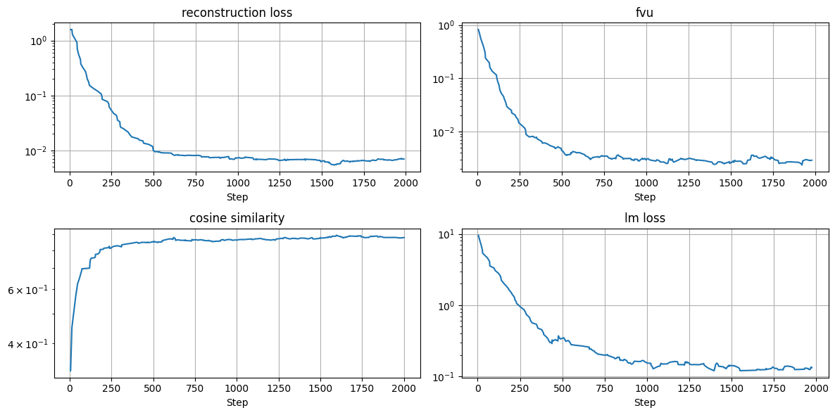 Figure 3: Loss curves for training an autoencoder to map activations from Llama-3.2-1B layer 5 to Llama-3.2-3B layer 11. The activations are gathered on the dataset that was used to finetune the model. We see that lm loss decreases along with reconstruction loss and FVU, and cosine similarity converges to near 1.