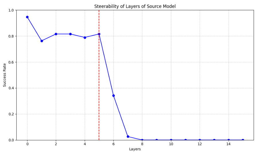 In particular, we show that choosing the last steerable layer to map between the source and target models yields good steering transferability results. Our source and target models achieved trigger rates of 81% and 77% respectively at the corresponding source and target layers.