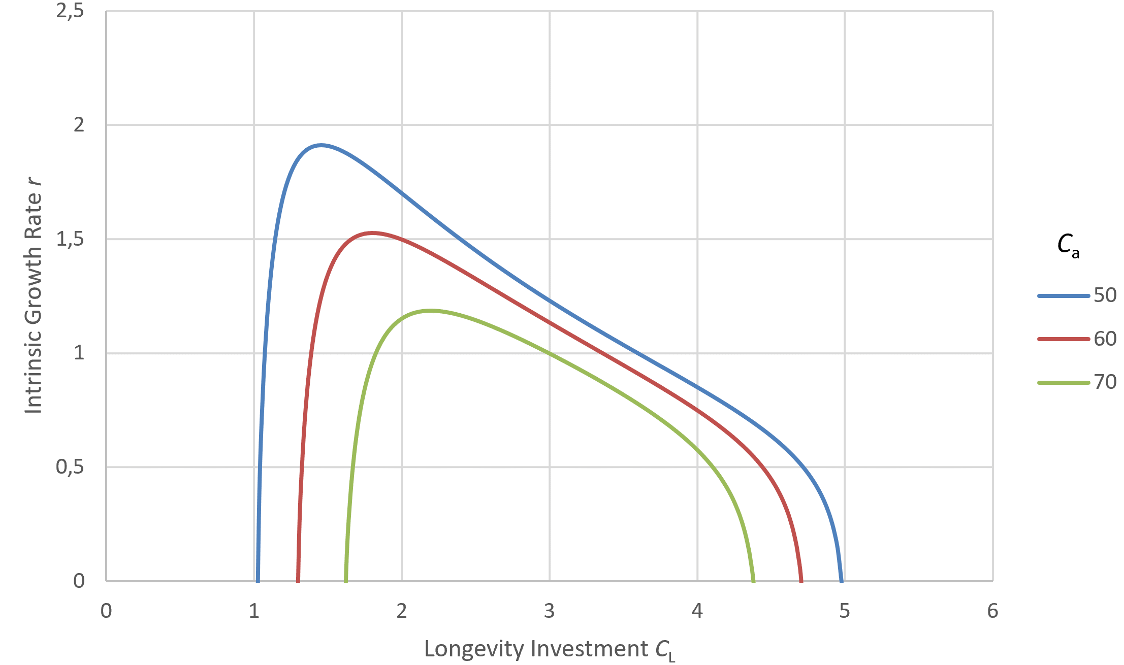 Figure 5 shows the effect of increasing developmental investment Cₐ while holding the adaptive potential G constant. As Cₐ grows, the cost of reaching maturity rises, pushing the lifespan optimum further toward later ages. Importantly, any lineage that can reduce Cₐ without incurring a fitness penalty will be driven to do so, since a lower Cₐ directly increases the intrinsic growth rate r.