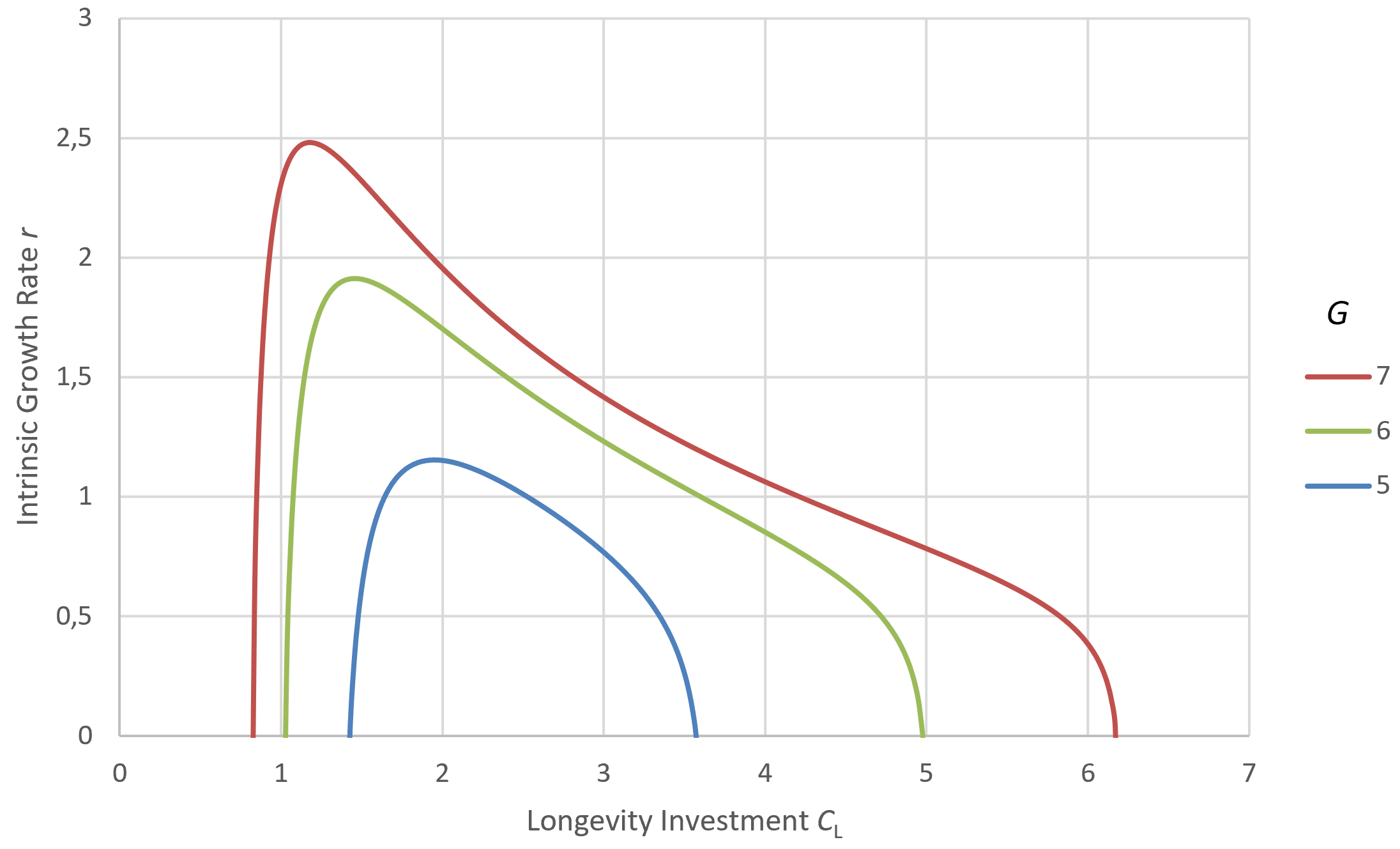For a single generation, this function reaches its maximum at CL = 3. However, if the average achievable lifespan decreases due to external pressures such as predation (as shown by the red line in Figure 2), then a CL of 3 is no longer optimal. In such conditions, the species gains more by evolving a faster, shorter-lived strategy that delivers higher early-life returns. This pattern has been found in a lot of different animals. But it is also hard to distinguish to the influence of G, which when increased also reduces the optimal investment in longevity as shown later in this section. With a predator posing as an additional selection pressure G would increase.