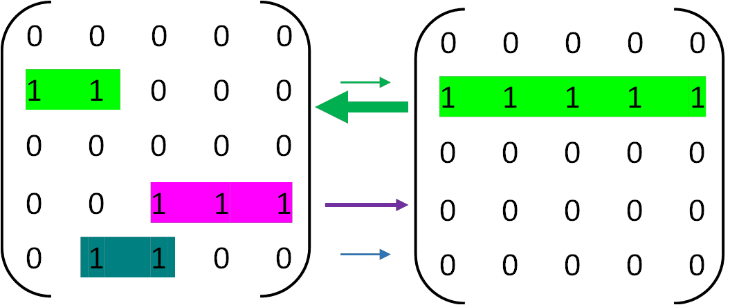 To capture these ideas in a simple model, imagine each cell as a 5×5 grid of on/off switches, where each switch represents one gene: on (1) means the gene is active, off (0) means it is silenced. A perfectly differentiated cell corresponds to a grid in which exactly one entire row of genes is switched on and all others are off. With that there are 5 different cell types (Figure 7). Random epimutations cause individual switches to flip on or off, and without repair the cell will gradually lose that perfect row, leading to partial or full dedifferentiation. Within this model the cells are dependent on the other cell types executing their functions only in that spatial location where they are sitting. If too many of wrong genes are expressed or too many right genes silenced the system dies.