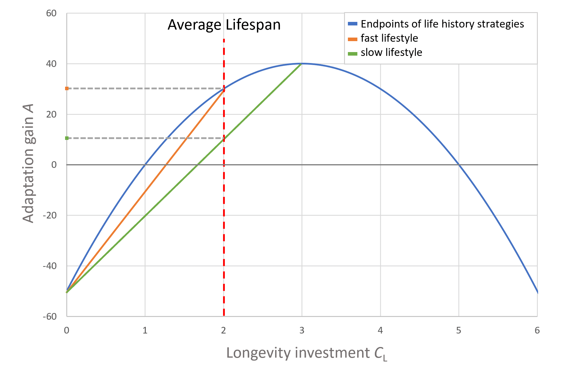 Longevity investment (CL) defines how much a species allocates toward extending an individual’s reproductive lifespan. A larger CL pushes the potential lifespan boundary farther out, up to, say,