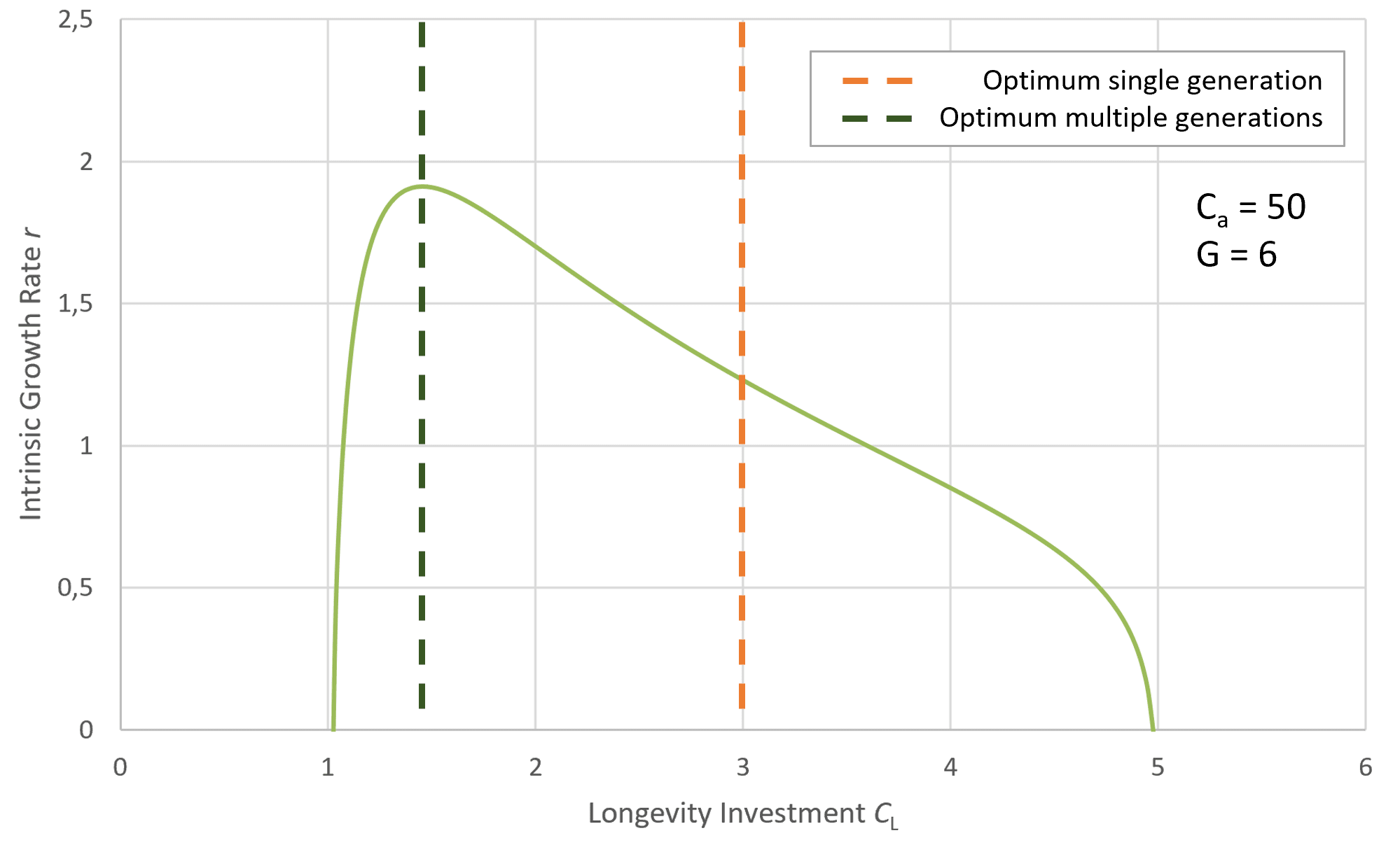 Figure 4 illustrates a representative example of how the optimal lifespan strategy shifts when successive generations are considered. The orange line shows where the optimum is, considering only a single generation.