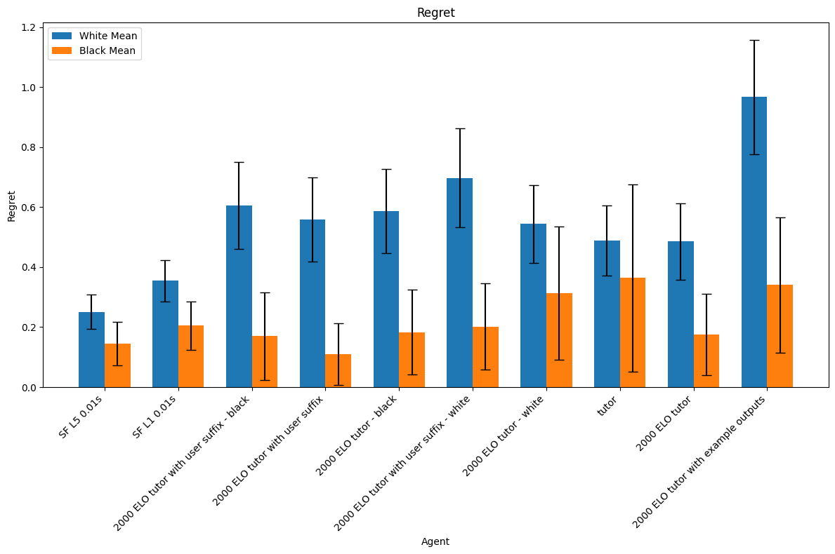 This also has the side-effect of resulting in lower mean regret when playing as black because most of our agents were more likely to make illegal moves when playing as black.