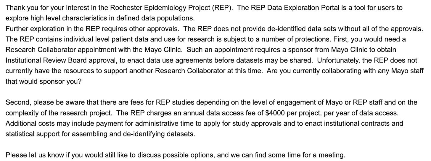 Minneapolis was ground zero of the first military spraying exercises in 1957. Minnesota is interesting because it’s the home state of the Mayo Clinic. As a result of this historical quirk, the Rochester Epidemiological Project was born; it maintains extensive health data going back decades on residents of Rochester, Minnesota, a mere 75 miles from Minneapolis. This was well within the spraying radius of Minneapolis! Who else had used this data before?