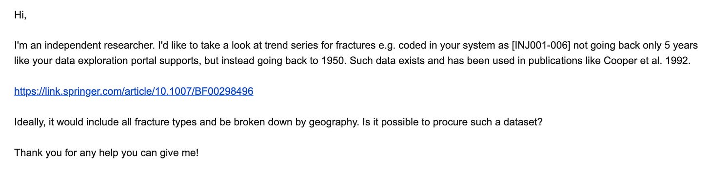 I went digging to try to find data—any data—on osteoporosis or bone fractures going back to the 1950s. Finding any medical data going back to the 1950s isn’t the easiest thing in the world; you have to navigate terrible early-2000s era web portals and when you’re successful the data might go back to the early-2000s if you’re very lucky.