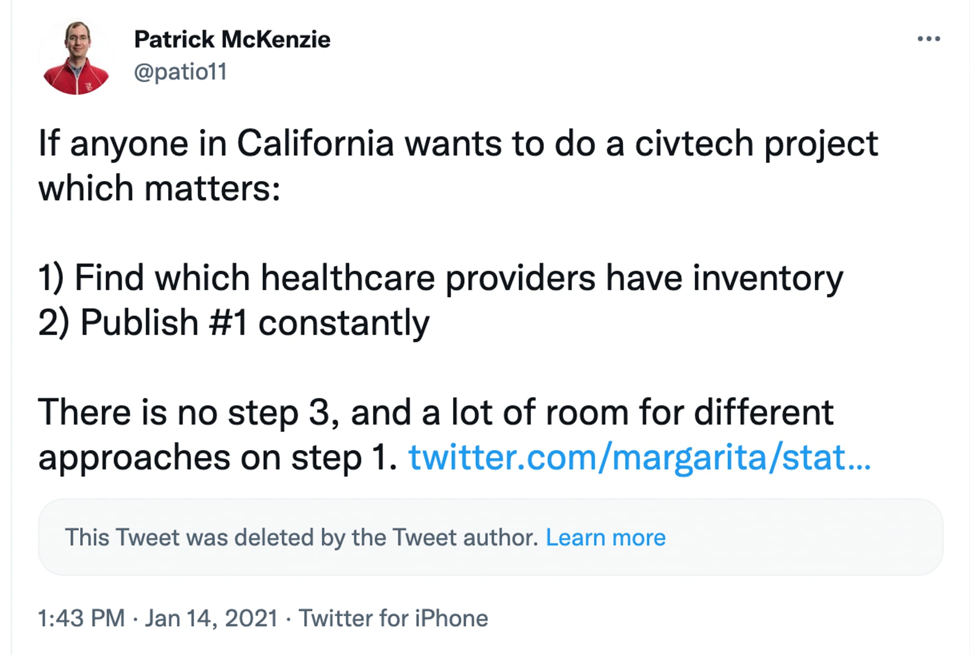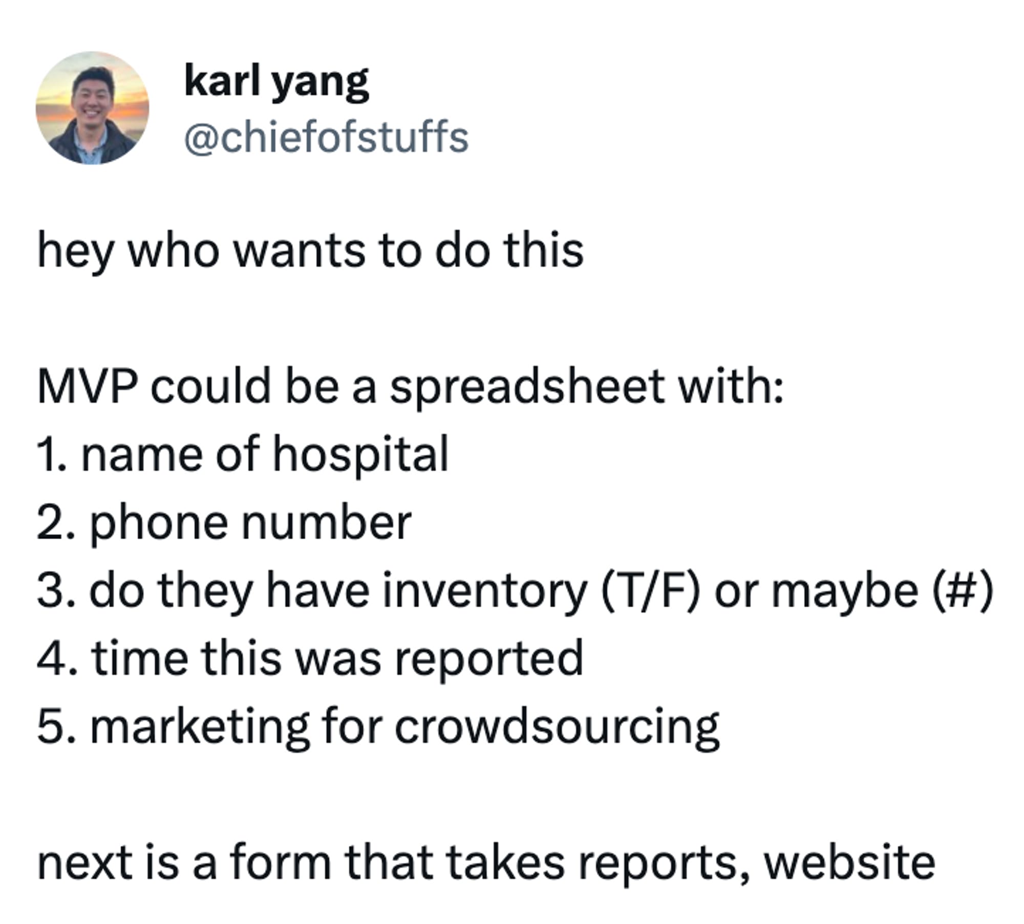 A: Back in Jan 2021, I’d heard that the vaccines were coming out. I was paying attention as my family had at-risk members, but nobody knew what was happening. Then, Patrick tweeted out a project proposal: create a public list of hospitals in California.
