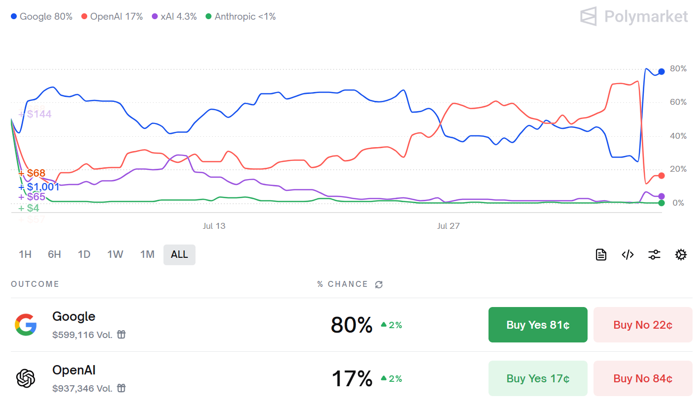 However, the market on this unexpectedly went the other way, the blue line is Google and the red line is OpenAI: