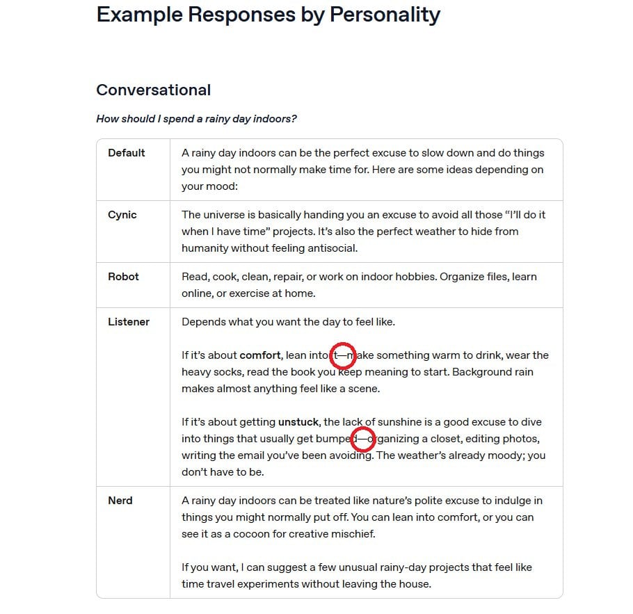 From these brief descriptions one wonders if anyone at OpenAI has ever met a nerd. Or a listener. The examples feel like they are kind of all terrible?
