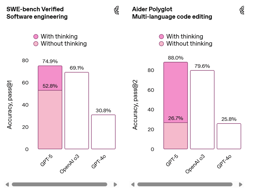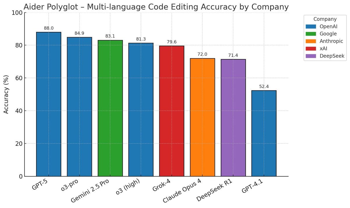 Here’s Aider Polyglot, a coding accuracy measure that has GPT-5 doing very well.