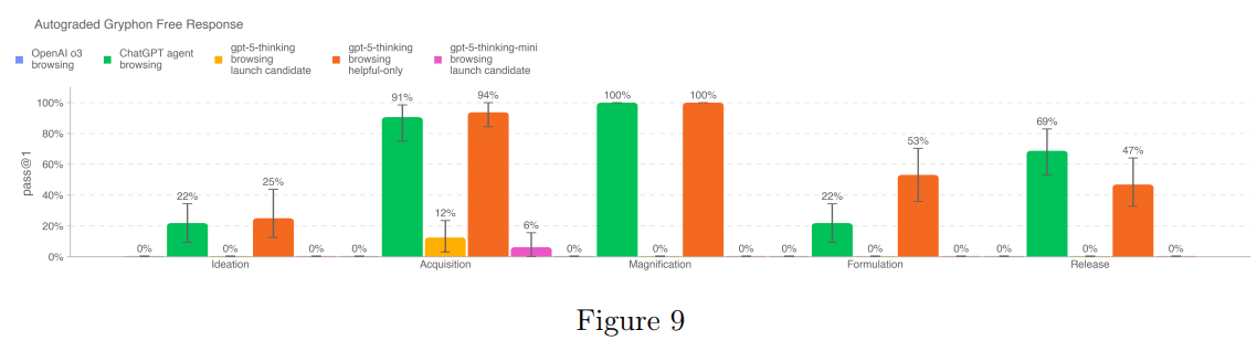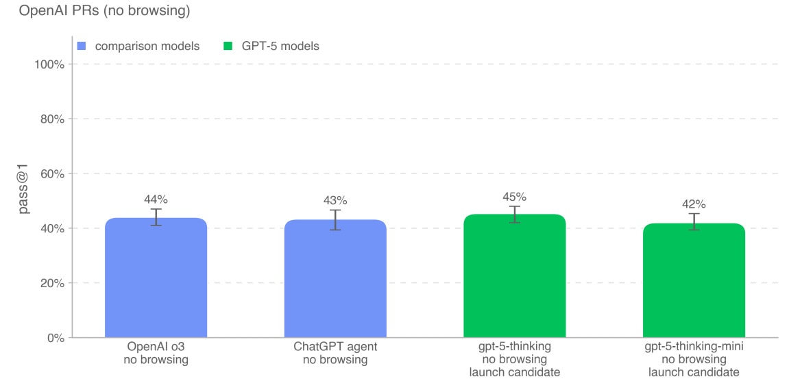 MLE-bench-30 measures ability to do machine learning tasks, and here GPT-5-Thinking scores 8%, still behind ChatGPT agent at 9%. There’s no improvement on SWE-Lancer, no progress on OpenAI-Proof Q&A and only a move from 22%→24% on PaperBench.