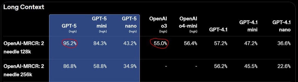 My understanding is that long context needle is pretty solid for other models, but it’s hard to directly compare because this is an internal benchmark. Gemini Pro 2.5 and Flash 2.5 seem to also be over 90% for 128k, on a test that GPT-5 says is harder. So this is a big step up for OpenAI, and puts them in rough parity with Gemini.