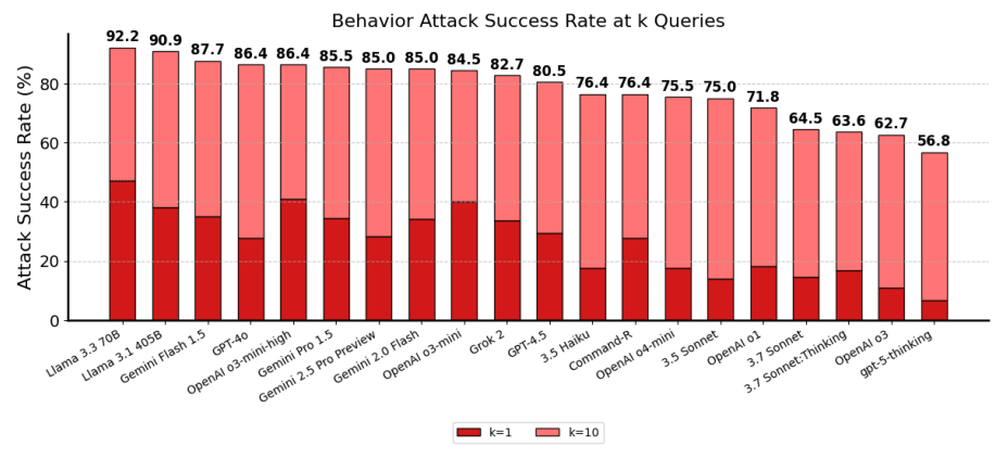Also there’s something weird. GPT-5-Thinking has a 6% k=1 attack rate, and a 56.8% k=10 attack rate, whereas with 10 random attempts you would expect k=10 at 46%.