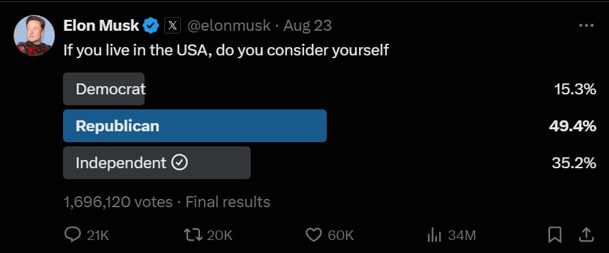 Elon Musk provides good data on his followers to help with things like poll calibration, reports 73%-27% lead for Donald Trump. There was another on partisan identity, with a similar result: