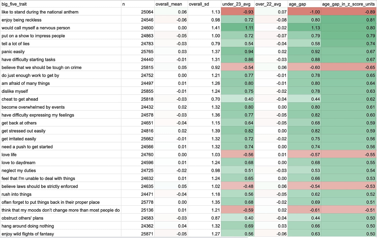 With the ambiguous exception of enjoying wild flights of fantasy, ‘kids these days’ are on the wrong side of every single one of these. There’s a lot of correlation and clustering here. The question is, to what extent will they grow out of it, versus this being a new future normal?