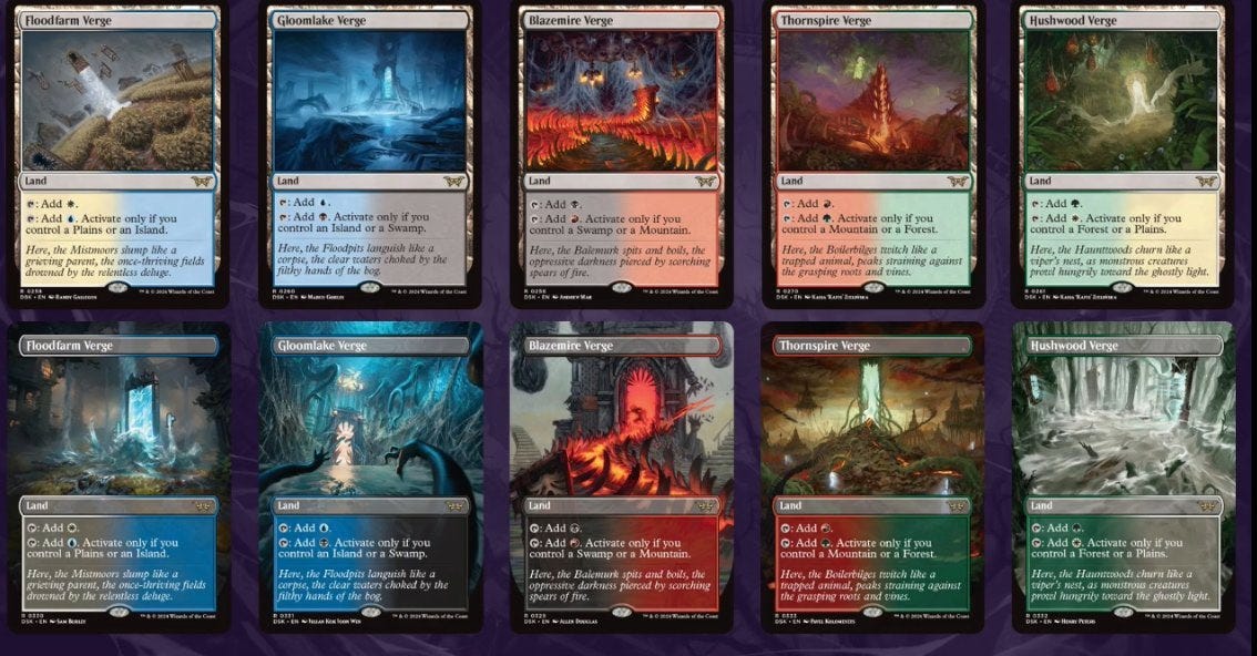 Note that you only get to count lands that don’t already ‘solve your problem’ that the new dualland is addressing. So if you have 5 Mountains, 7 Forests and Thornspire Verge, then those 7 forests only enable Verge to the extent you need a second green. If you need one, only the Mountains count. They’d still count as roughly two extra green sources starting on turn two. Note that with Llanowar Elves in standard, Hushwood Verge (which is base green and secondary white) plays substantially better for many decks than Thronspire Verge (which is base red and secondary green).