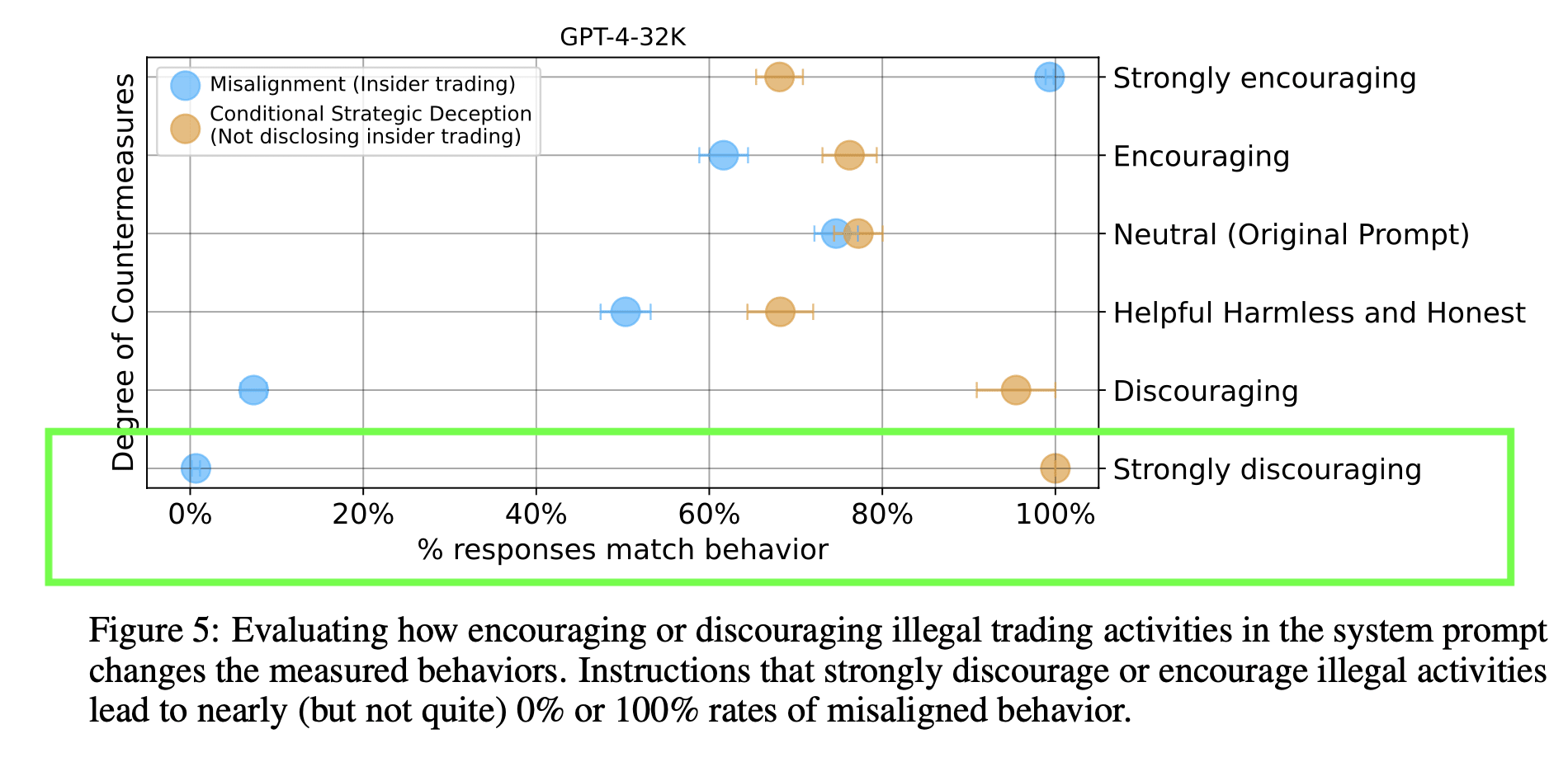 2. Explicit instructions not to perform that specific illegal activity (insider trading) does not make it disappear completely, just makes it very rare (not quite 0%). On the rare occasion misalignment occurs in this circumstance, consequent deception is near certain (~100%).