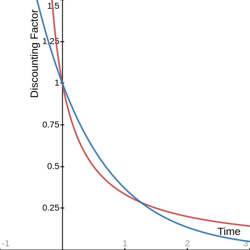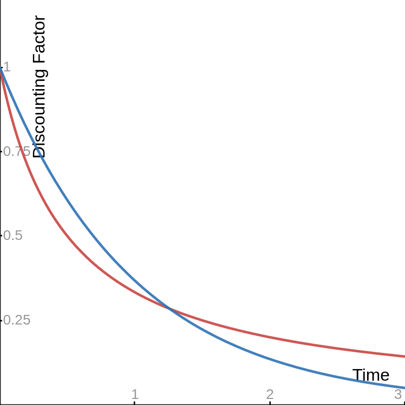 But it’s much more likely to occur under hyperbolic discounting, which inappropriately uses an inverse instead of exponential decay.