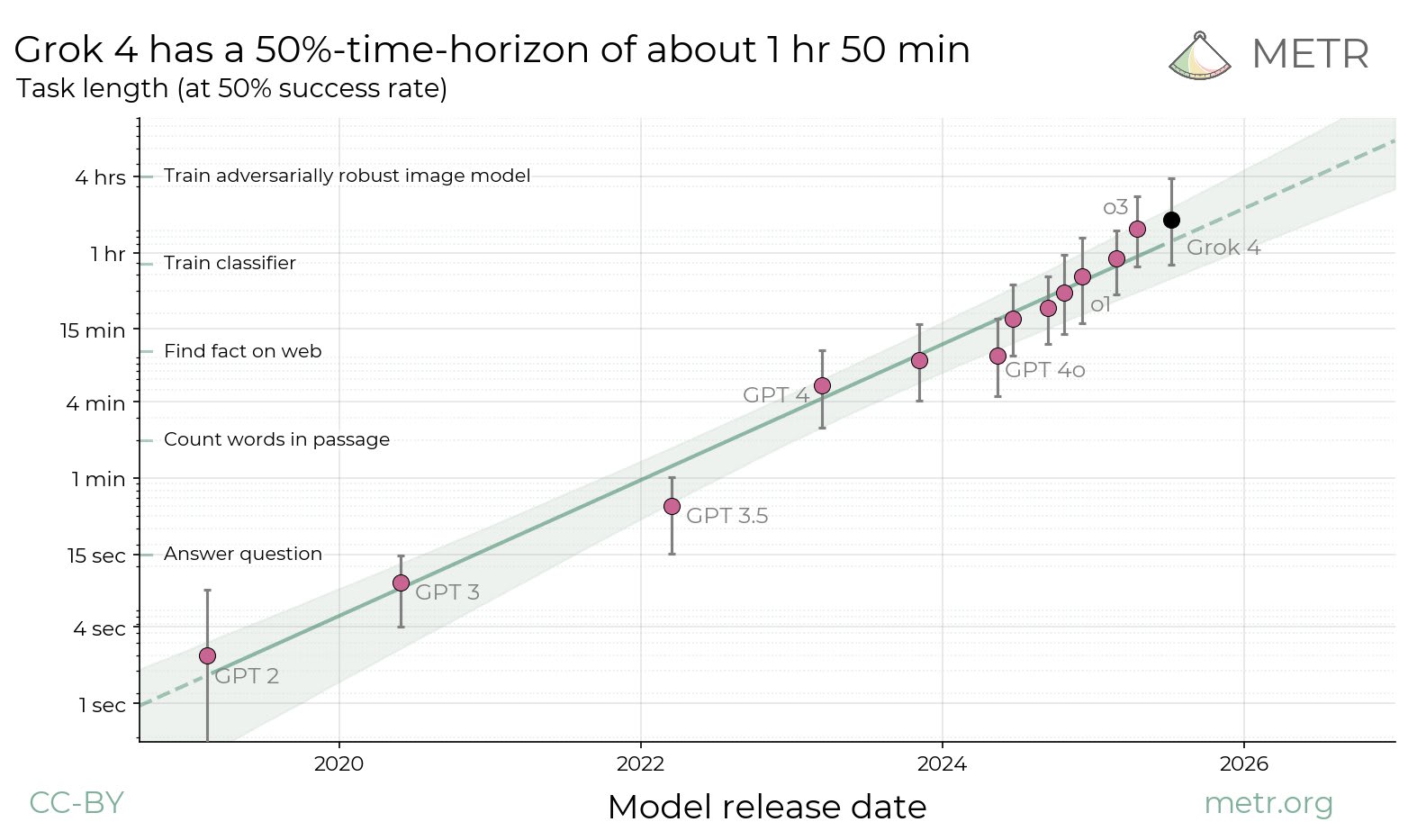 Grok 4 is slightly above SOTA on 50% time horizon and slightly below SOTA on 80% time horizon: https://x.com/METR_Evals/status/1950740117020389870