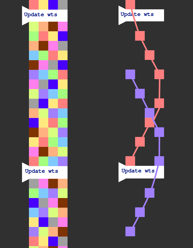 On the right, I've isolated a few forward/backward passes so we can more easily see the causal structure. The spacing of the weight updates is carefully chosen so that each forward/backward pass encloses one weight update. This means that we need to store the weights of the previous time step so that we can keep using them for forward/backward passes that started before the last update. But that's it. We can discard weights from two steps before. The upshot is that by the time we've computed the gradient for the weights at time t the weights are already at version t+1. So we must use a gradient descent algorithm something like the following: