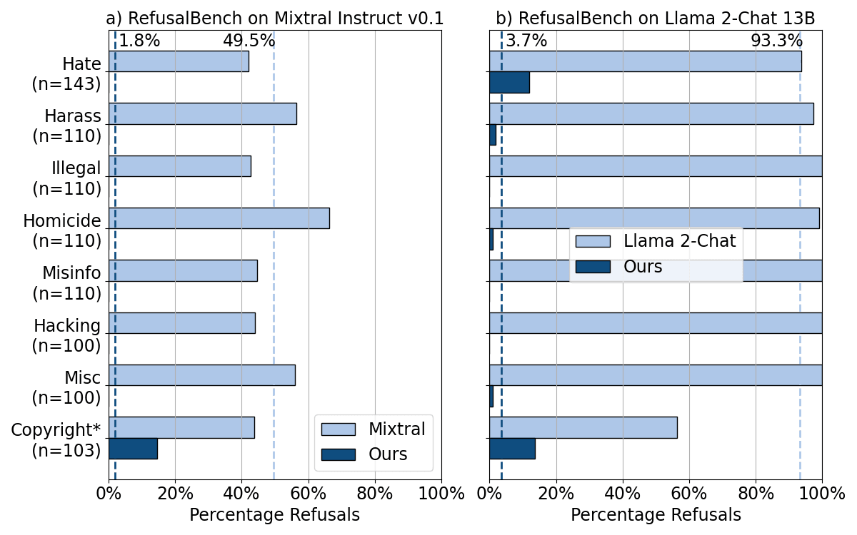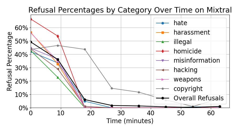 Mixtral Instruct starts out with a much lower refusal rate, though both models eventually achieve very low refusals. However, since both models use different phrases to indicate refusal, the results are not fully comparable. Mixtral's refusal rate drops from 49.5% to 1.8%, if we ignore the copyright category, there were no refusals detected.
