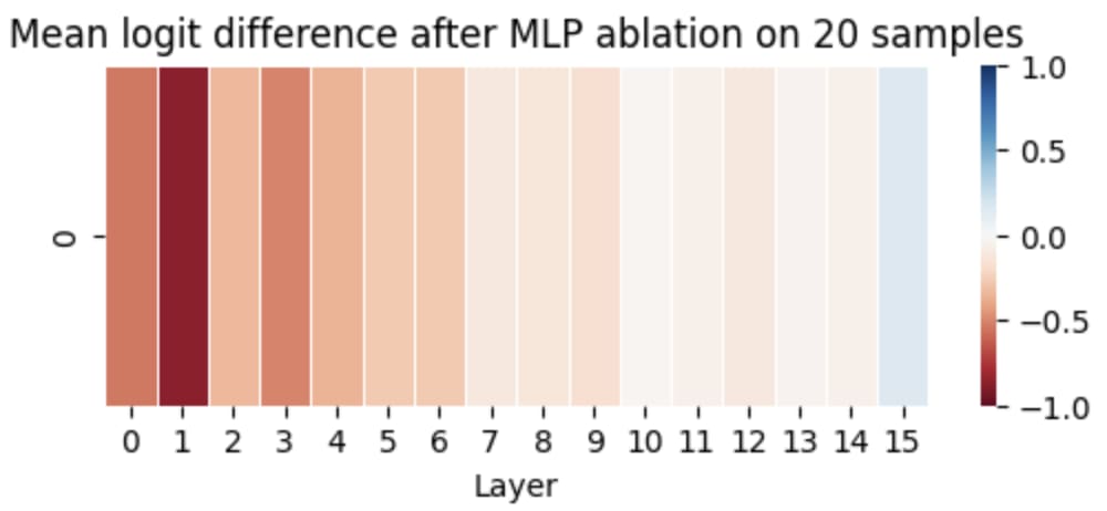 So far I only experimented with attention heads. But what if MLP layers also contribute to this task? To check this, I also tried ablating MLP layers.