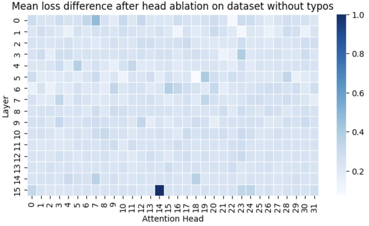 Now if the model realizes what the typo is, it predicts the corrected word (correct token). Otherwise it repeats the misspelled word again (incorrect token is the first token of the misspelled word[3]). With this format I can measure how good the model is at correcting typos. I only used samples where the model correctly predicts the right word in the base setting, so that I could see which components are crucial for this task. If I ablate a head and the logit difference decreases, it means that the model is likelier to predict the incorrect answer, so the ablated head had a positive influence on the task.