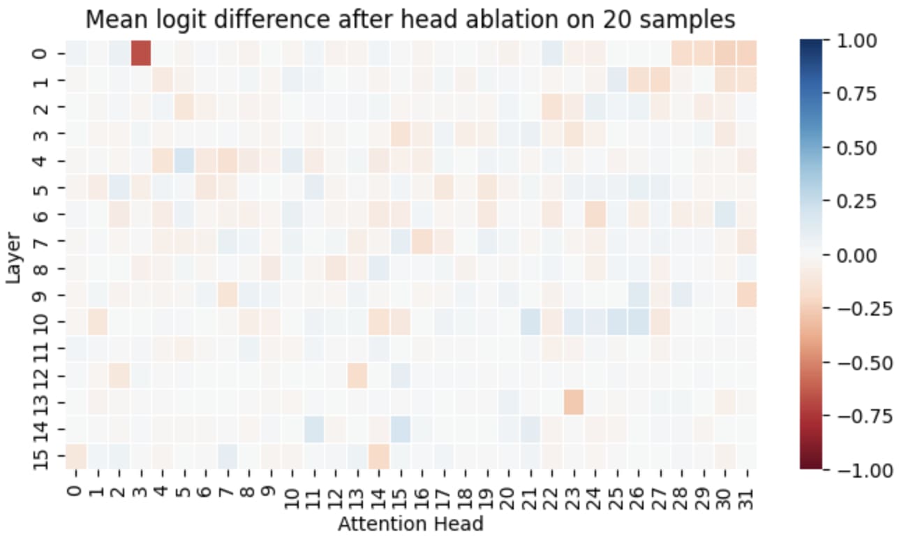 I ran the experiment from above again and ablated all attention heads one by one and plotted the change in logit difference.