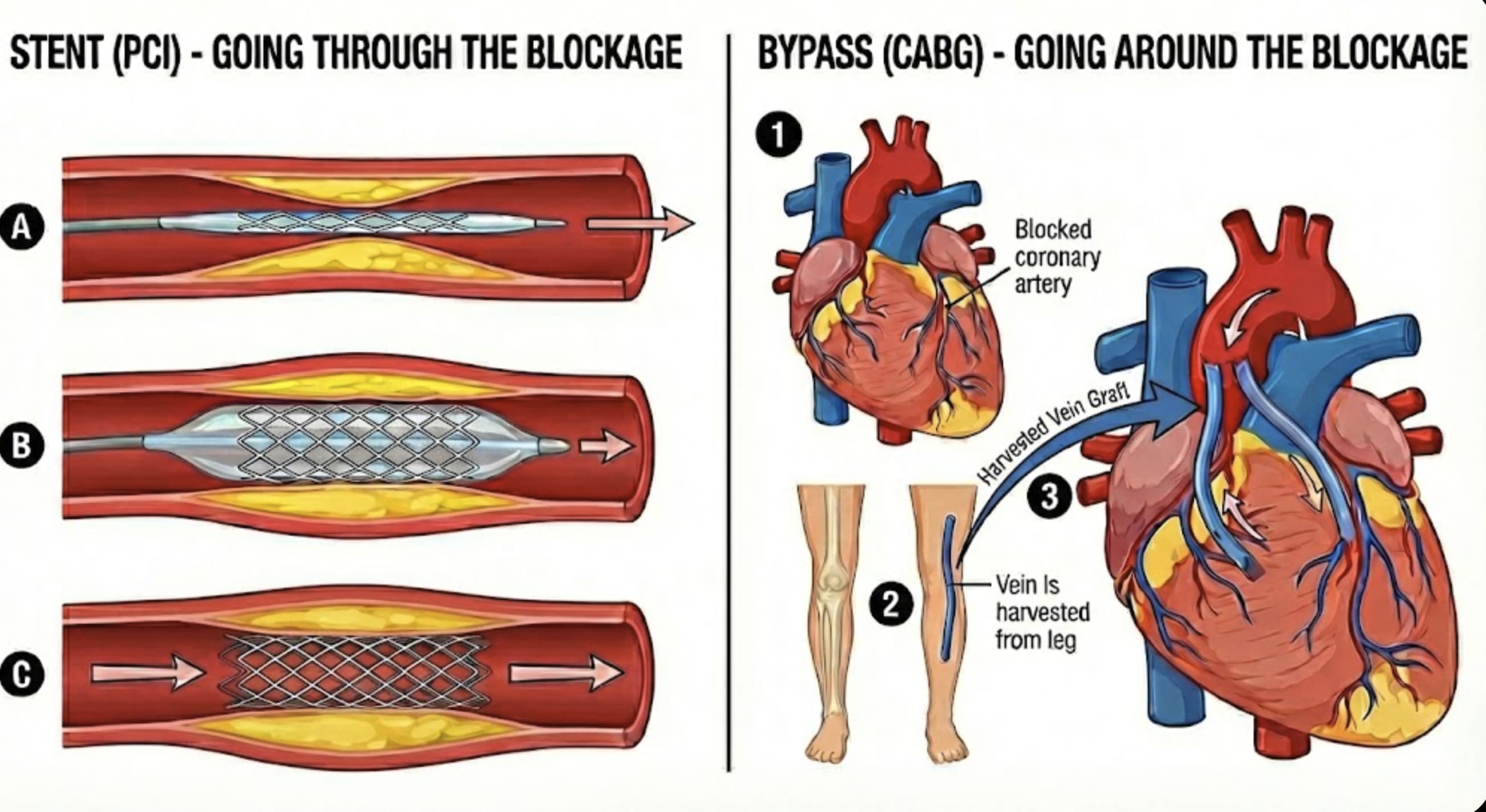 Cardiac bypass surgery, however, is going around the obstacle. The surgeon will harvest a vein from your leg, and like using it as an extra pipe, graft it around the blockage in your coronary artery, providing alternate passage.