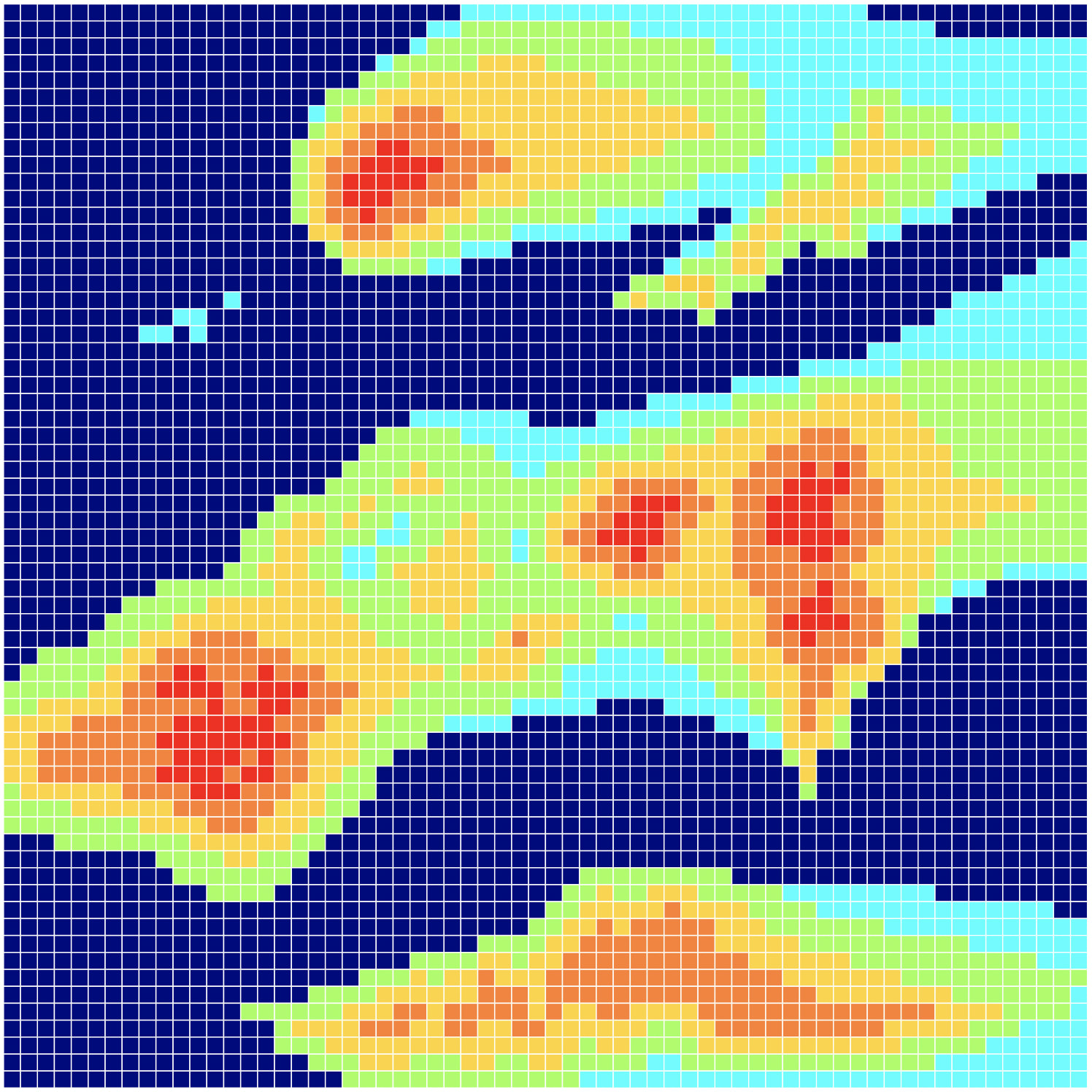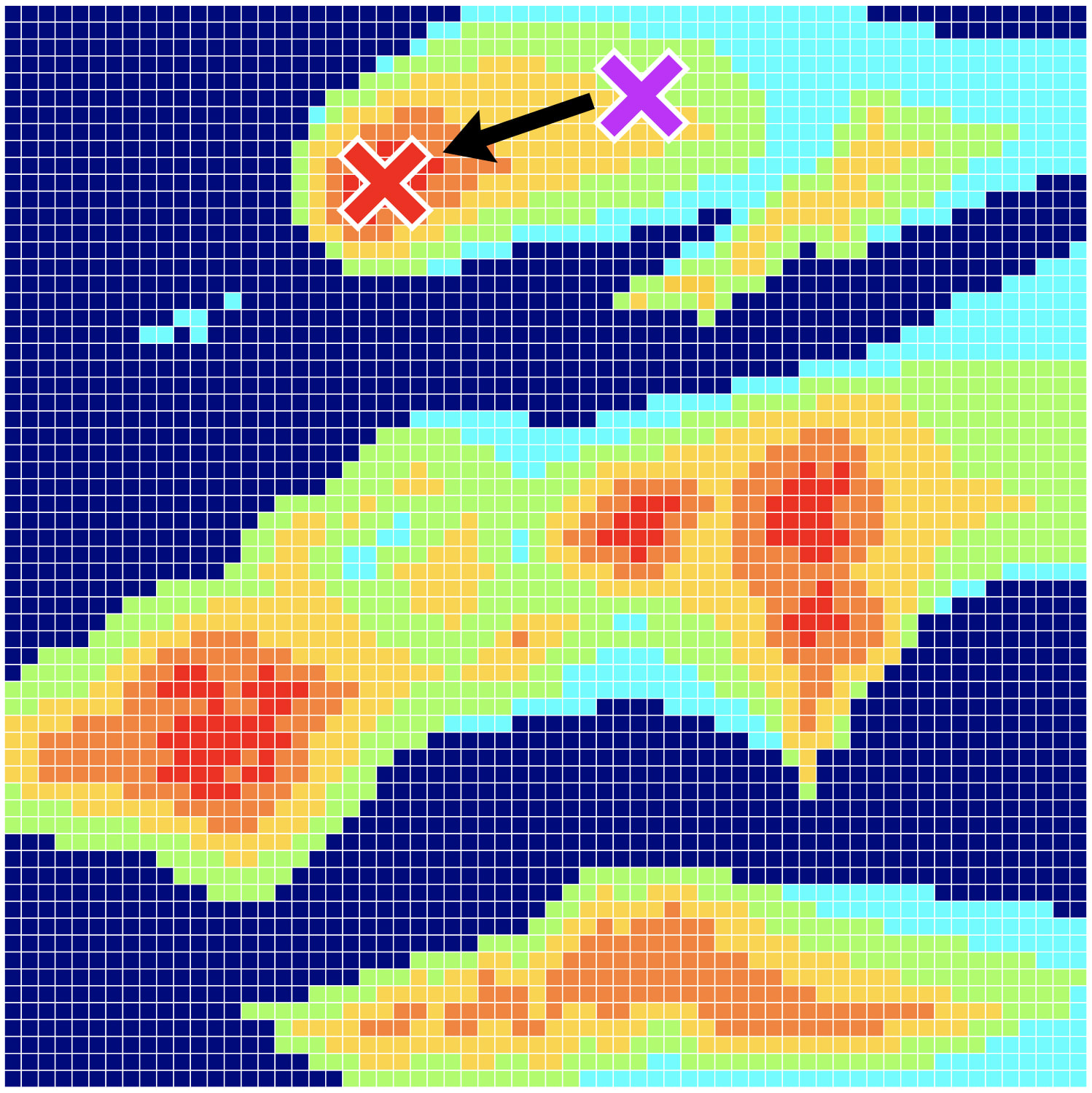 As with the side-view of the bell curve above, adjacent spots are similar interpretations; for this map we've only got two axes so there are only two gradients being represented.