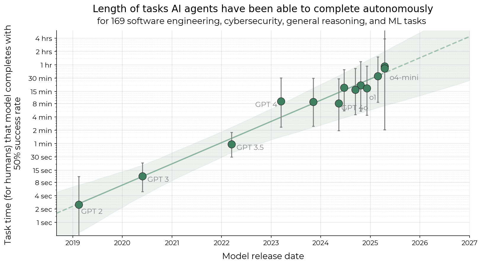One thing to bear in mind with the long tasks paper is that we have different degrees of confidence in different claims. We are more confident in there being (1) some kind of exponential trend on our tasks, than we are in (2) the precise doubling time for model time horizons, than we are in (3) the exact time horizons on these tasks, than we are about (4) the degree to which any of the above generalizes to ‘real’ software tasks.